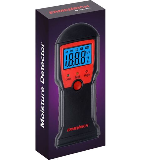 Le Ermenrich Wett MW10 est un détecteur d'humidité de avec des aiguilles pour déterminer la teneur en humidité du bois, des mélanges de construction et des mortiers. L'appareil peut également mesurer la température en degrés Celsius ou Fahrenheit. Commande simple à un bouton. Les mesures sont affichées sur l'écran intégré avec de grands chiffres et un rétroéclairage bleu de. Sous de l'écran, three LED indicators provide a general indication of the level de humidity existing in the material : green means low humidity, yellow means medium humidity and red means high humidity . The device is quite compact, lightweight and easy de to hold in the hand. Les aiguilles de mesure de sont cachées sous de le couvercle amovible. Sur la face inférieure, vous trouverez un compartiment pour une pile de 9 volts de. En outre, thededede dispose d'une fonction d'arrêt automatique et d'un indicateur de batterie faible dede icône sur l'écran pour surveiller la durée de vie de la batterie dede. ...
