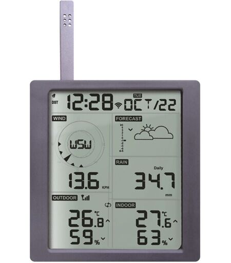 Station météo Levenhuk Wezzer PRO LP310 Fonctions : horloge, calendrier, réveil, thermomètre, baromètre, hygromètre, anémomètre/capteur de vent, capteur de pluie, point de rosée, vent, précipitations, indice de vent et Wi-Fi. Un capteur à distance 5 en 1 est inclus Levenhuk Wezzer PRO LP310 est une station météorologique dont les fonctionnalités et la précision ont été conçues pour un usage professionnel, tandis que sa simplicité et sa facilité ded'utilisation en font un excellent instrument domestique. Cet appareil peut mesurer la température et l'humidité extérieures et intérieures, la vitesse et la direction du vent, ainsi que le niveau des précipitations. L'écran lumineux affiche non seulement les informations météorologiques, mais aussi la date et l'heure. Il est également doté d'un réveil. Les données extérieures sont collectées par un capteur à distance 5-en-1 sensible, dont la portée peut atteindre 100 mètres (en visibilité directe). La distance maximale par rapport à l'unité ...