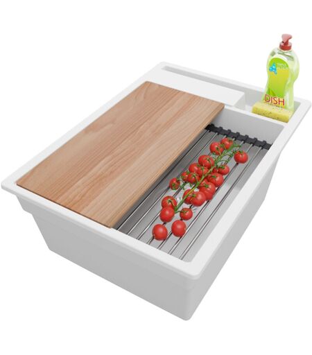 Primagran - Evier Cuisine en Granit 38x53cm, Lavabo 1 bac + Kit de Vidage + Accessoires, Évier à Encastrer au meuble 40cm - Oslo Pocket, Tout Blanc