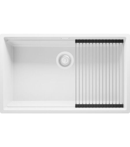 Primagran - Evier Sous Plan 76x47cm, Evier en Granit 1 bac + Kit de Vidage + Égouttoir Enroulable, Évier au meuble 80cm - Prague, Tout Blanc