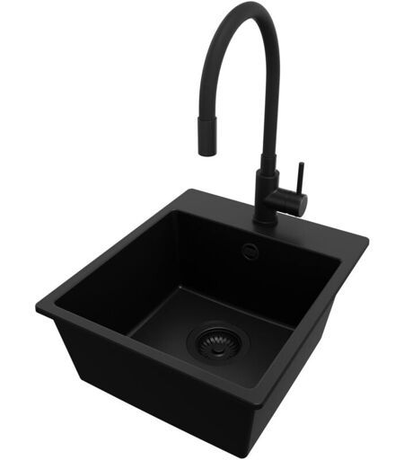 Primagran - Evier Cuisine en Granit 38x44cm, Lavabo 1 bac + Robinet 40x38cm + Kit de Vidage, Évier à Encastrer au meuble 40cm - Riga Easy, Tout Noir