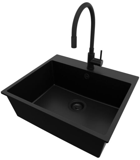 Primagran - Evier Cuisine en Granit 58x50cm, Lavabo 1 bac + Robinet 40x38cm + Kit de Vidage, Évier à Encastrer au meuble 60cm - Riga, Tout Noir