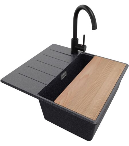Primagran - Evier Cuisine en Granit 55x50cm, Lavabo 1 bac + Robinet 32x20cm + Kit de Vidage + Accessoire, Évier à Encastrer au meuble 40cm