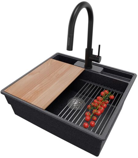 Primagran - Evier Cuisine en Granit 58x53cm, Lavabo 1 bac + Robinet 40x20cm + Kit de Vidage + Accessoires, Évier à Encastrer au meuble 60cm - New