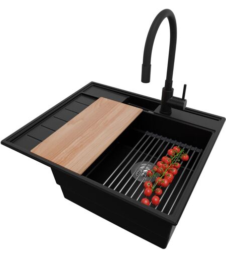 PRIMAGRAN Evier Cuisine en Granit 62x53cm, Lavabo 1 bac + Robinet 40x38cm + Kit de Vidage + Accessoires, Évier à Encastrer au meuble 45cm - Sydney