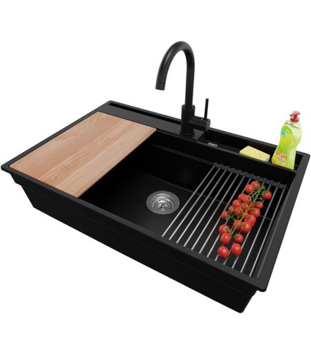 Primagran - Evier Cuisine en Granit 78x53cm, Lavabo 1 bac + Robinet 32x20cm + Kit de Vidage + Accessoires, Évier à Encastrer au meuble 80cm - Oslo