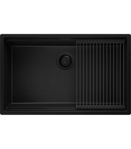 Primagran - Evier Sous Plan 76x47cm, Evier en Granit 1 bac + Kit de Vidage + Égouttoir Enroulable, Évier au meuble 80cm - Prague, Tout Noir