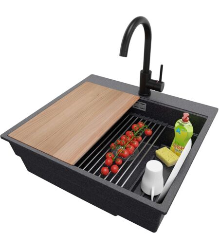Primagran - Evier Cuisine en Granit 58x53cm, Lavabo 1 bac + Robinet 32x20cm + Kit de Vidage + Accessoires, Évier à Encastrer au meuble 60cm - Oslo