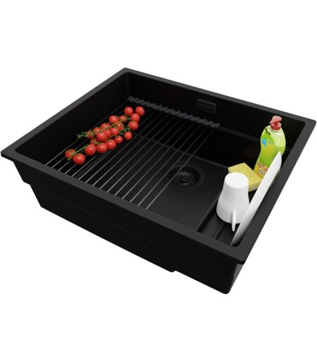 Primagran - Evier Sous Plan 56x47cm, Evier en Granit 1 bac + Kit de Vidage + Égouttoir Enroulable, Évier au meuble 60cm - Prague, Tout Noir
