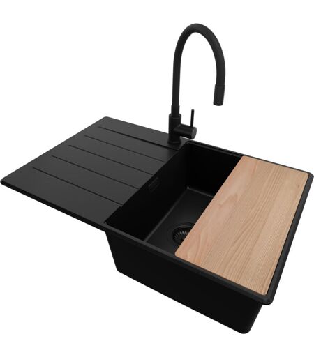 Primagran - Evier Cuisine en Granit 78x50cm, Lavabo 1 bac + Kit de Vidage + Accessoire, Évier à Encastrer au meuble 50cm - Copenhague, Tout Noir