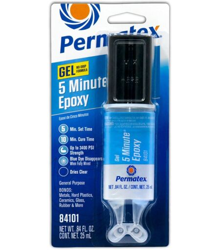 Colle époxy transparente 5 Min - 25ml PERMATEX 5 Minute General Purpose Polyvalents, faciles à utiliser, l'adhésif multifonctions bi-composant évite les soudures. S'applique en cinq minutes, pas besoin de serrage. Apparence claire. Excellent remplissage et pas de rétrécissement au séchage. Résistant à l'eau aux solvants. Plages de température -51°C à 82°C. Comment ça fonctionne : Mélangez simplement les deux composants selon les instructions du fabricant, appliquez la colle sur la zone à réparer, et laissez sécher. En cinq minutes, la colle aura pris, offrant une liaison solide et durable. Une fois sec, la réparation est prête à être utilisée, résistante à l'eau, aux solvants et aux températures extrêmes. ...