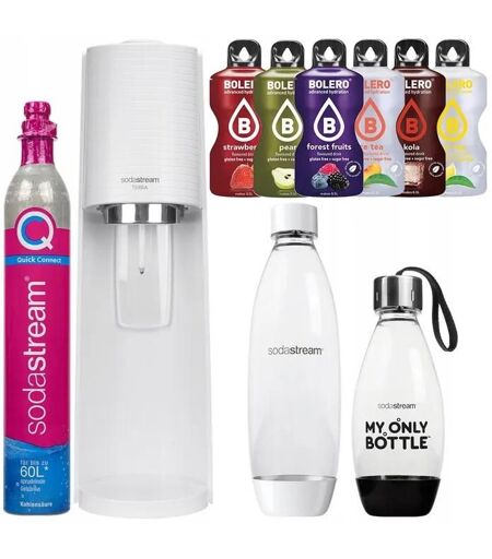SODASTREAM TERRA SATUREUR D'EAU BLANC 2 BOUTEILLES CARTOUCHE CO2 + 6 BOISSONS Pack complet Terra blanc : machine, cartouche CO¿, bouteilles et 6 sirops variés. ...