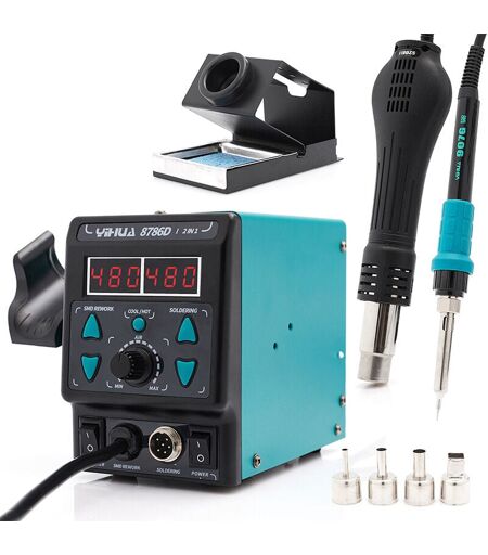 Station de soudage Yihua 8786D-I 2en1✅ 2en1 - Air chaud et porte-filtre✅ Deux écrans✅ Électronique moderne à l'intérieur✅ Système de refroidissement du porte-filtre à air chaud✅ Fonction veille⚡ Puissance 740W✅ Chauffage rapide✅ Régulation de la température de l'air chaud : 100 - 480°C✅ Régulation de la température de la pointe : 200 - 480°C✅Puissance de soufflage réglable✅Boîtier compact - ne prend pas beaucoup de place L'ensemble de stations comprend : 1️⃣ Station de soudage à air chaud Yihua 8786D-I (version améliorée) 2️⃣ Support pour pistolet à air chaud 3️⃣ Cordon d'alimentation 4️⃣ Support pour pistolet à pointe avec une éponge de nettoyage 5️⃣ Pistolet à pointe 907G avec une pointe montée4 buses remplaçables : 6️⃣ buse ronde d'un diamètre de 4,4 mm 11307️⃣ buse ronde d'un diamètre de 7 mm 11968️⃣ buse ronde d'un diamètre de 9 mm 11979️⃣ buse carrée 12x12 mm 1313 ⚡ Station de soudage à air chaud et fer à souder. ⚡ L'appareil est utilisé pour souder et dessouder des composants ...
