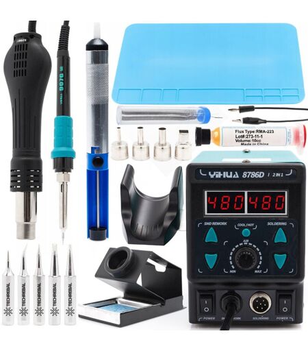 Station de soudage Yihua 8786D-I + KIT10 2en1✅ 2en1 - Air chaud et porte-filtre✅ Deux écrans✅ Électronique moderne à l'intérieur✅ Système de refroidissement du porte-filtre à air chaud✅ Fonction veille⚡ Puissance 740W✅ Chauffage rapide✅ Régulation de la température de l'air chaud : 100 - 480°C✅ Régulation température de la grotte : 200 - 480°C✅ Puissance de soufflage réglable✅ Boîtier compact - ne prend pas beaucoup de place ⚡ Station de soudage à air chaud et fer à souder. ⚡ L'appareil est utilisé pour souder et dessouder des composants électroniques. Il conviendra aussi bien aux amateurs qu'aux ateliers professionnels.⚡ L'appareil se caractérise par un boîtier compact qui prend peu de place.⚡ 2 écrans clairs dans la station Yihua 8786D-I facilitent le travail, ils indiquent la température réelle du fer à souder et du pistolet à air chaud.⚡ La ballon d'air chaud est équipé d'un mode automatique : en plaçant le ballon d'air chaud sur le support, il refroidit automatiquement jusqu'à ce ...