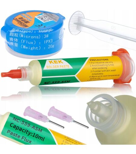 Set Rosfix: Flux Flux in siringa NC-559-ASM + Pasta saldante (stagno liquido) XG-30 16 g Il set Rosfix composto da flux flux NC-559-ASM in siringa e pasta saldante XG-30 da 16 g è la scelta ideale per professionisti e appassionati di elettronica alla ricerca di materiali per saldatura di alta qualità. Flux Flux in siringa NC-559-ASM : Applicazione precisa : Grazie alla siringa, il flux può essere applicato esattamente dove serve, il che è particolarmente importante quando si lavora con piccoli componenti elettronici. Alta qualità : NC-559-ASM è un flusso senza colofonia che offre un'eccellente conduttività elettrica e migliora l'adesione della saldatura, fondamentale per giunzioni di saldatura durevoli. Pasta saldante (stagno liquido) XG-30 : Alta viscosità e fluidità : la pasta saldante XG-30 ha la giusta consistenza, che la rende facile da applicare e consente di creare giunzioni di saldatura durevoli e di alta qualità. Ampia applicazione : ideale per saldare componenti SMD, ...
