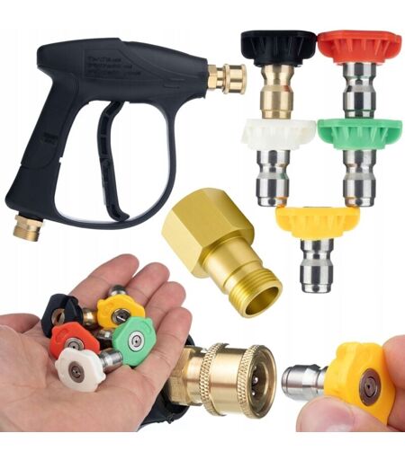 Kit 5 buses + pistolet Karcher 4350 PSI 22 mm + adaptateur Easy!Lock M22 300 bars Nettoyeur haute pression Remplacement 4.111-030.0 Pour façades, pavés, véhicules ✅ Pistolet pour nettoyeur haute pression Karcher 4350 PSI – robuste, jusqu'à 300 bars, avec raccord 22 mm et raccord rapide, résistant à une utilisation intensive ✅ Kit de 5 buses de nettoyage – différents angles de jet (0°, 15°, 25°, 40°, basse pression) pour un réglage précis de la puissance de nettoyage ✅ Adaptateur de réduction Easy!Lock → M22 – permet d'utiliser les anciens accessoires avec filetage M22 sur les nouveaux nettoyeurs Karcher HD/HDS avec système Easy!Lock ✅ Utilisation universelle – nettoyage de pavés, façades, véhicules, machines, terrasses et outils ✅ Matériaux résistants – acier, laiton et plastique renforcé résistant à la haute pression et à la température ✅ Kit prêt à l'emploi – tous les éléments sont parfaitement adaptés et compatibles ✳️ Spécifications : ✔️ Pistolet : pression max. 300 bars, ...
