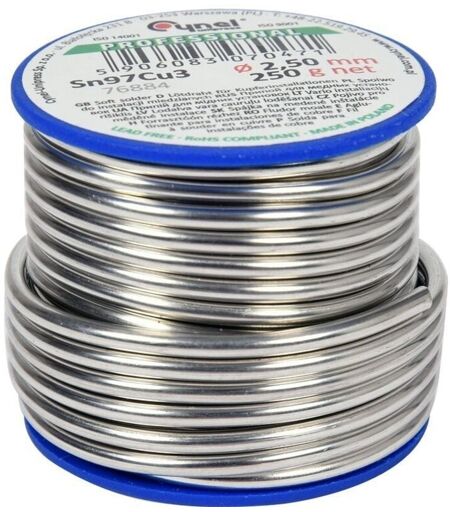 Description du produit S-Sn97Cu3 (L-Sn97Cu3) Métal d'apport DIN EN29453, étain avec ajout de 3 % de cuivre, utilisé pour le brasage tendre de tuyaux et raccords en cuivre ou en laiton dans les installations d'eau chaude et froide, ainsi que dans les systèmes de chauffage central. Point de fusion de 220 °C à 310 °C. Pour le brasage tendre, nous recommandons l'utilisation de pâtes et de flux. Utilisation prévue / Application Utilisé pour le brasage tendre de tuyaux et raccords en cuivre ou en laiton dans les installations d'eau chaude et froide, ainsi que dans les systèmes de chauffage central. Données techniques Numéro d'index 76884 EAN 5906083070471 Marque Cynel ...