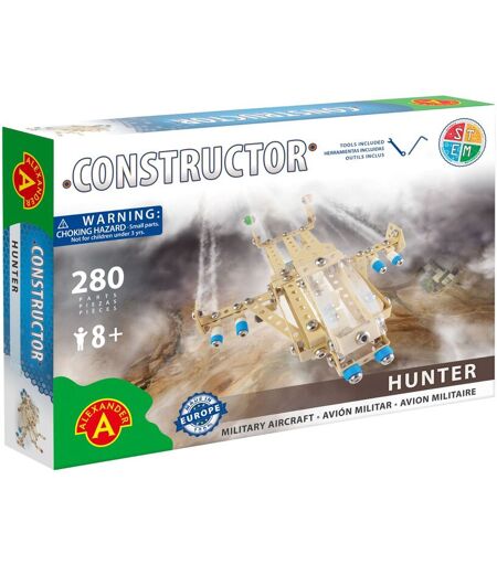 Constructor Hunter - Avion militaire (280 pièces). Un jeu de construction intemporel fabriqué en métal chromé, avec des pièces en plastique colorées, dont l'assemblage se fait au moyen de vis et d'écrous. 100% fabriqué en Europe. Ce set de construction pour enfant à partir de 8 ans est livré avec des outils adaptés aux petites mains des enfants, pour visser ou dévisser leurs constructions à l'infini. Des instructions détai ...