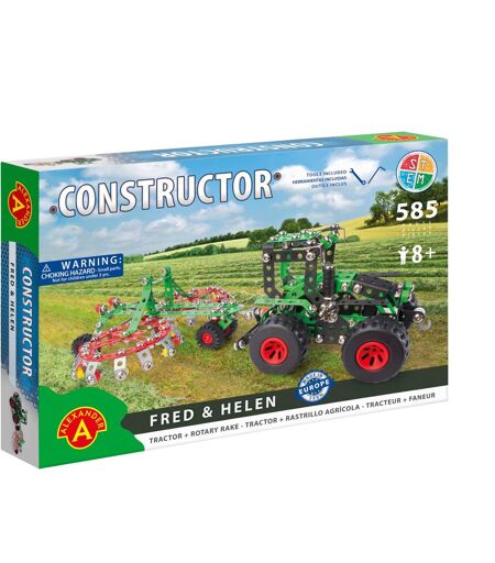 Constructor Fred & Helen - Tracteur et Faneur (585 pièces). Un jeu de construction intemporel fabriqué en métal chromé, avec des pièces en plastique colorées, dont l'assemblage se fait au moyen de vis et d'écrous. 100% fabriqué en Europe. Ce set de construction pour enfant à partir de 8 ans est livré avec des outils adaptés aux petites mains des enfants, pour visser ou dévisser leurs constructions à l'infini. Des instr ...