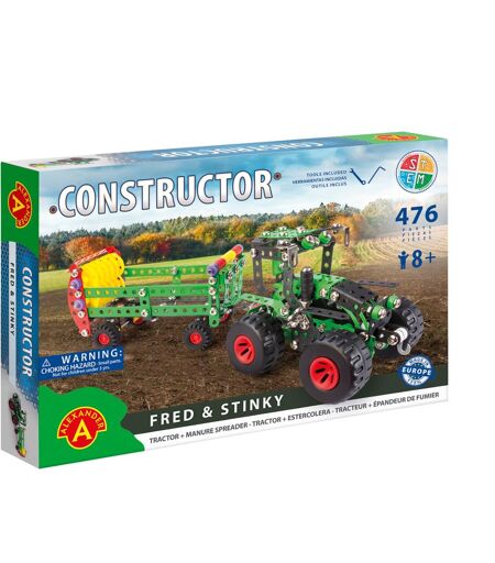 Constructor Fred & Stinky - Tracteur et Épandeur à fumier (476 pièces). Un jeu de construction intemporel fabriqué en métal chromé, avec des pièces en plastique colorées, dont l'assemblage se fait au moyen de vis et d'écrous. 100% fabriqué en Europe. Ce set de construction pour enfant à partir de 8 ans est livré avec des outils adaptés aux petites mains des enfants, pour visser ou dévisser leurs constructions à ...