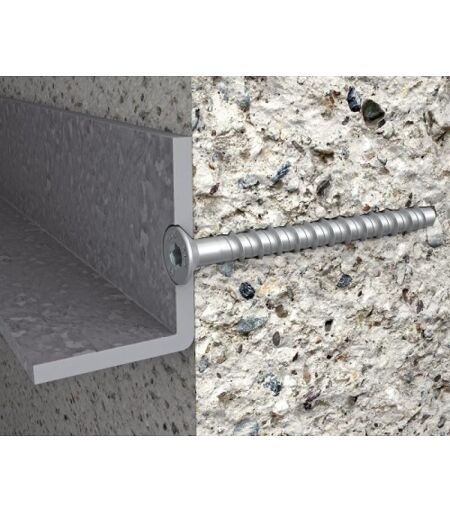 Vis à bétonVis à béton R-LX tête fraisée acier zingué Vis à béton auto-taraudeuse pour fixation lourde dans le béton. Pose au travers de la pièce à fixer. Vissage direct après perçage. Entièrement démontable. Pour fixer : Balustrades Description Le produit Vis à béton auto-taraudeuse pour fixation lourde dans le béton. Pose au travers de la pièce à fixer. Vissage direct après perçage. Entièrement démontable. Pour fixer : Balustrades et mains courantes, clôtures, portail, rayonnage, sièges public, échafaudage... Caractéristiques Unité de vente (1 boîte)Les + produit Fixation en bord de dalle possible.Norme du produit ATE option 1 : béton non fissuré et béton fissuré.Caractéristiques techniques diamètre (mm) 6.30 longueur (mm) 75 conditionnement 100 diamètre de perçage (mm) 5 Épaisseur à fixer maximum (mm) 50 Épaisseur à fixer minimum (mm) 25 ...