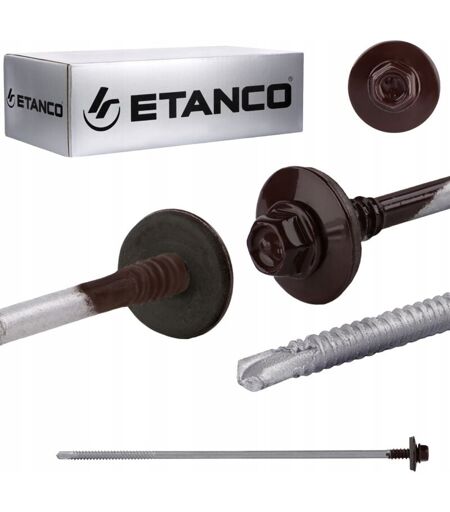 Vis pour panneaux sandwich avec rondelle en aluminium et joint EPDM Conçues pour la fixation de panneaux sandwich sur des structures en acier jusqu'à 6 mm d'épaisseur Paramètres clés Modèle : GTR 6 SP A19 Longueur de vis : 200 mm Épaisseur des panneaux pouvant être installés : 145-175 mm Capacité de perçage dans l'acier : jusqu'à 6 mm Douille : SW8 Matériau : acier galvanisé avec revêtement gRey.coat. Classe de corrosion : C1-C4 Couleur : 8017 Emballage : 100 pièces. Produit original d'une entreprise renommée Etanco® Avantages 1. Revêtement de peinture POWDER.COAT Protection anticorrosion supplémentaire significative et correspondance parfaite avec la couleur du revêtement dans la palette RAL/NCS. Les stabilisateurs UV garantissent la cohérence des couleurs même après une douzaine d'années, et la technologie moderne de revêtement en poudre Powder.coat garantit la durabilité du revêtement lors de l'installation et une longue durée de vie. 2. Rondelle EPDM Fabriquée à partir du meilleur ...