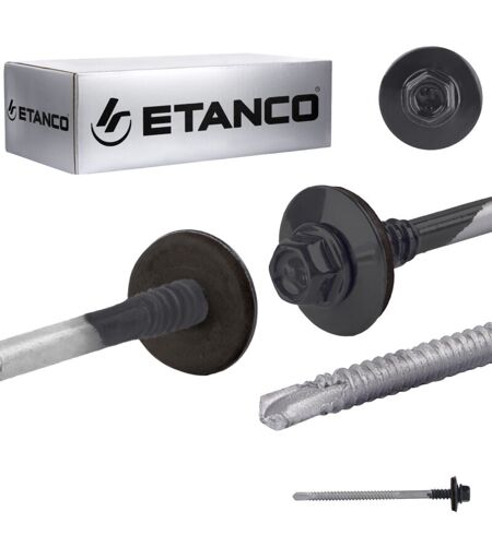 Vis pour panneaux sandwich avec rondelle en aluminium et joint EPDM Conçues pour la fixation de panneaux sandwich sur des structures en acier jusqu'à 6 mm d'épaisseur Paramètres clés Modèle : GTR 6 SP A19 Longueur de vis : 90 mm Épaisseur des panneaux pouvant être installés : 35-65 mm Capacité de perçage dans l'acier : jusqu'à 6 mm Douille : SW8 Matériau : acier galvanisé avec revêtement gRey.coat. Classe de corrosion : C1-C4 Couleur : 7016 Emballage : 100 pièces. Produit original d'une entreprise renommée Etanco® Avantages 1. Revêtement de peinture POWDER.COAT Protection anticorrosion supplémentaire significative et correspondance parfaite avec la couleur du revêtement dans la palette RAL/NCS. Les stabilisateurs UV garantissent la cohérence des couleurs même après une douzaine d'années, et la technologie moderne de revêtement en poudre Powder.coat garantit la durabilité du revêtement lors de l'installation et une longue durée de vie. 2. Rondelle EPDM Fabriquée à partir du meilleur ...