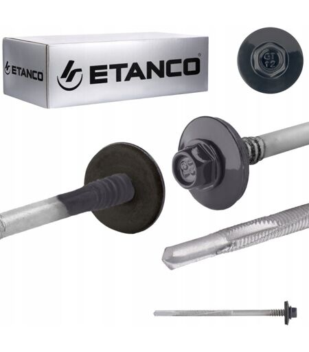 Vis pour panneaux sandwich avec rondelle en aluminium et joint EPDM Conçues pour la fixation de panneaux sandwich sur des structures en acier jusqu'à 12 mm d'épaisseur Paramètres clés Modèle : GTR 12 SP A19 Longueur de vis : 110 mm Épaisseur des panneaux pouvant être installés : 45-70 mm Capacité de perçage dans l'acier : jusqu'à 12 mm Douille : SW8 Matériau : acier galvanisé avec revêtement gRey.coat. Classe de corrosion : C1-C4 Couleur : RAL 7016 Emballage : 100 pièces. Produit original d'une entreprise renommée Etanco® Avantages 1. Revêtement de peinture POWDER.COAT Protection anticorrosion supplémentaire significative et correspondance parfaite avec la couleur du revêtement dans la palette RAL/NCS. Les stabilisateurs UV garantissent la cohérence des couleurs même après une douzaine d'années, et la technologie moderne de revêtement en poudre Powder.coat garantit la durabilité du revêtement lors de l'installation et une longue durée de vie. 2. Rondelle EPDM Fabriquée à partir du ...
