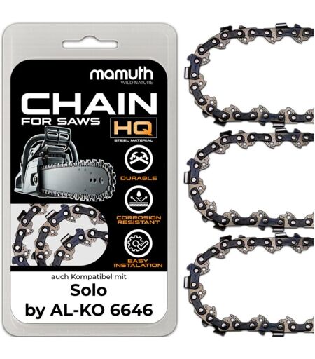 Pour Solo by AL-KO 6646 Cette chaîne de tronçonneuse robuste et fabriquée avec précision est un élément indispensable pour tout utilisateur de tronçonneuse – qu’il soit professionnel ou amateur. Elle assure une coupe nette, une longue durée de vie et un travail en toute sécurité. Avantages : Haute durabilité et résistance à l'usure Excellente netteté des dents – coupes rapides et propres Faibles vibrations – meilleur confort de travail Évacuation améliorée des copeaux – risque d'obstruction réduit Compatible avec de nombreux modèles de tronçonneuses courants ...