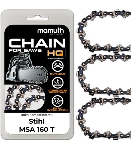 Pour Stihl MSA 160 T Cette chaîne de tronçonneuse robuste et fabriquée avec précision est un élément indispensable pour tout utilisateur de tronçonneuse – qu’il soit professionnel ou amateur. Elle assure une coupe nette, une longue durée de vie et un travail en toute sécurité. Avantages : Haute durabilité et résistance à l'usure Excellente netteté des dents – coupes rapides et propres Faibles vibrations – meilleur confort de travail Évacuation améliorée des copeaux – risque d'obstruction réduit Compatible avec de nombreux modèles de tronçonneuses courants ...
