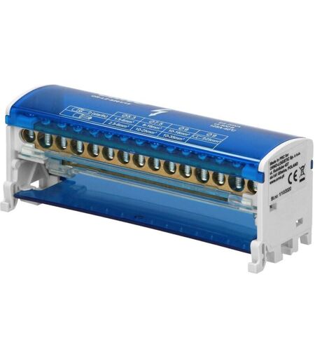 Les répartiteurs montés sur rail DIN ou sur plaque de montage sont constitués de deux rails de bornes dans un boîtier. Ils sont utilisés dans les tableaux de distribution électrique pour la distribution du potentiel et le câblage. Informations générales Type : Répartiteur Nombre de rails : 2 Nombre de conducteurs : 15 Bornes d’entrée [mm²] : 11 x 1,5-6, 2 x 6-16, 2 x 10-16 Matériau conducteur : Laiton Montage : Rail DIN / plaque de montage Dimensions (L/H/P [mm]) : 135 / 42 / 50 Couleur : Bleu / Gris ...