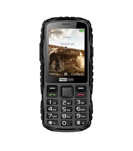 Mobile Dual SIM Maxcom en noir, avec 2,8 pouces LCD TFT, résolution 240 x 320 pixels, IP67 résistance de certificat, slot micro SD (jusqu'à 32 Go) principal 2MP, Li-Ion 1.500mAh, connexion Bluetooth, SMS, MMS, lampe de poche, radio et lecteur multimédia. ...