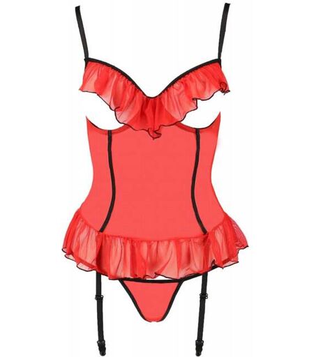 Pour des nuits encore plus coquines, enfilez cette Guêpière Ouverte Cherry Devil Collection Rouge de Passion qui soulignera vos courbes. Une superbe guêpière rouge transparente en maille fine avec une coupe ouverte aérienne, vos courbes se dévoileront sous une transparence exquise... Des petits volants habilleront vos hanches de manière hyper glamour. Vos seins seront très légèrement couverts par des volants rouges eux-mêmes bordés d'une lanière noire venant créer les bretelles réglables dans le dos. Ses bretelles viendront se prolonger à l'arrière en jarretelles réglables tout comme à l'avant. Le mélange de la couleur rouge passion transparente au noir intense des bretelles et lanières sera sensationnel et la guêpière laissera à découvert vos formes misent en valeur par le string ficelle sexy assorti ! Composition : 75% Polyester, 15% Polyamide, 10% Elasthanne Tailles S/M, L/XL, XXL/XXXL. ...