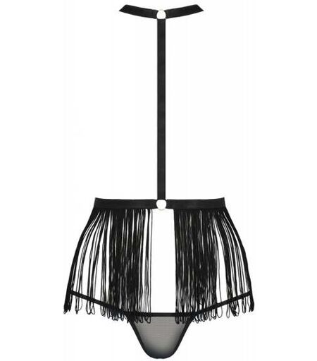 Pour des nuits encore plus coquines, enfilez cet Ensemble 2 Pièces Indra Devil Collection Noir qui épousera sensuellement vos courbes. Mélange entre harnais noir satiné et frange fantaisie, l'ensemble Indra viendra s'attacher délicatement autour de votre cou à l'aide d'une lanière satinée noire afin de créer des bretelles croisées réglables. Cette même lanière parcourt le devant de votre corps pour rejoindre le dessus des hanches et les habiller avec une forme de jupette à frange. La coupe de cet ensemble laissera entrevoir vos atouts et le string ficelle assorti tout en vous habillant de manière sexy et irrésistible. Composition : 75% Polyester, 15% Polyamide, 10% Elasthanne Tailles S/M, L/XL, XXL/XXXL. ...