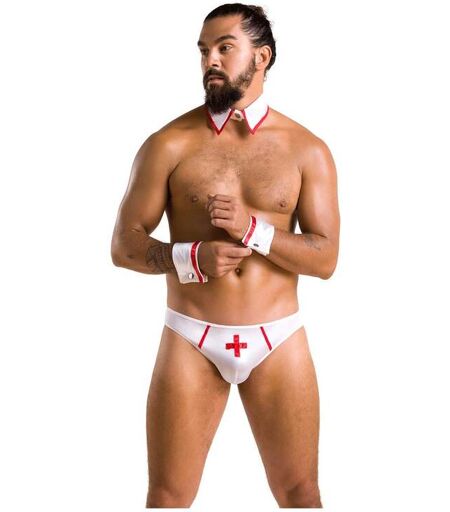 Je prends soin de votre partenaire. Je suis votre costume infirmier Gregory de la marque Passion ! Constitué d'un slip, d'un col et de manchettes, je vous transforme en infirmier sexy qui contribue étrangement à faire grimper la température de son patient ! En maille opaque blanche, mon slip agrémenté de bandes et d'une croix rouges est l'outil parfait pour distraire votre partenaire lors de votre examen un brin plus sensuel que prévu ! Une paire de manchettes ainsi qu'un col assortis complètent mon look pour ajouter ce brin d'élégance qui fera frissonnner votre partenaire d'une fièvre passionnelle des plus grisantes... Composition : 75% Polyester, 15% Polyamide, 10% Élasthanne   Tailles S/M, L/XL, 2XL/3XL. ...