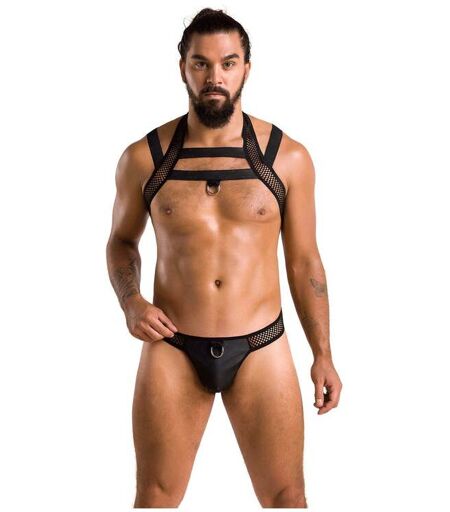 J'affirme votre sensualité. Je suis votre ensemble 2 pièces Jacob noir de la marque Passion ! Constitué d'un harnais de buste et d'un jockstrap, je suis spécialement créé pour vous offrir un look aussi érotique qu'exceptionnel ! Tout d'abord, mon harnais en résille et lanières noires souligne la partie supérieure de votre corps tout en vous graitfiant d'un style magnétique. Pour un brin d'audace supplémentaire, j'ajoute un anneau métallique à l'avant pour que vous puissiez jouir de vos accessoires fétiches et pousser vos jeux érotiques à un tout autre niveau ! Ensuite, je couvre le bas d'une maille en imitation cuir noire agrémentée de bandes en résille et laisse vos fesses complètement exposées au regard de votre partenaire. De plus, j'ajoute une chaînette en argent afin que vous conserviez une allure élégante et sensuelle à tout instant ! Composition : 60% Polyuréthane, 40% Polyester Tailles S/M, L/XL, 2XL/3XL. ...