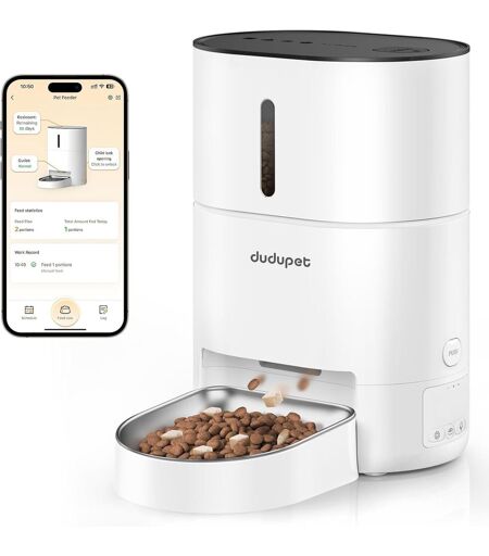 Télécommande WIFI 2,4 GHz PET distributeur croquettes chat automatique supporte la télécommande WIFI 2,4 G. L'application est très simple et intuitive et garde une trace de l'alimentation effectuée. Il est donc possbile de nourrir votre animal de compagnie n'importe où et enregistrer à temps. Enregistrement audio Vous pouvez enregistrer votre voix et ainsi indiquer à votre animal que la nourriture arrive dans le bol.Appuyez et maintenez le bouton pour commencer l'enregistrement, et il prend en charge jusqu'à 10 secondes.Il suffit de distribuer la nourriture soit par programmation, soit manuellement. Capacité de 4L La mangeoire automatique pour chats a une grande capacité de 4L avec un fermoir intégré empêchant le chat d'ouvrir. Il vous permet de mieux gérer l'alimentation de votre animal de compagnie.Ladistributeur croquette chien est également conçue avec un sac déshydratant intégré (inclus) pour garder la nourriture fraîche. Double alimentation Le distributeur croquettes chat automatique wifi peut util r un adaptateur DC 5V ou connecter une pile alcaline 3 D (non incluse) comme source d'alimentation de secours. Nous recommandons d'util r les deux méthodes de chargement afin que votre chat puisse être nourri même si l'alimentation est interrompue pendant votre absence. Livraison et garantie après-vente 1 distributeur croquettes ; 1 plateau en acier inoxydable ; adaptateur 5V ; 1 sac déshydratant ; 1 manuel d'instructions. Si vous avez des questions, n'hésitez pas à nous contacter, nous vous donnerons certainement une réponse satisfaisante. ...
