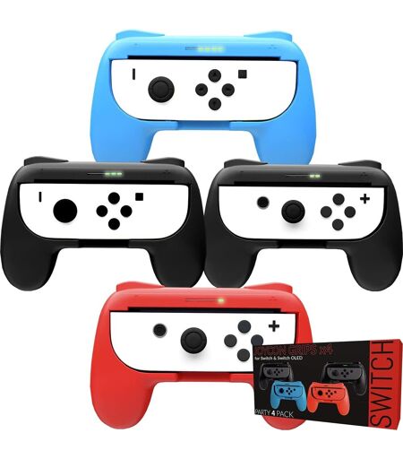 4 POIGNÉES UNIVERSELLES POUR JOY-CONS Idéal pour les jeux à plusieurs joueurs ! Compatibles avec les jeux Super Smash Bros Ultimate, Snipperclips, Streetfighter II Ultimate, Kart 8 Deluxe, Party Switch, etc\u2026 (Seulement les jeux Nintendo Switch) CONFORT DE JEU Orzly Grips a été façonné pour que vos Joy-Cons se sentent comme une véritable manette de jeu traditionnel. Découvrez le confort ultime ! SL & SR FACILE D\u2019ACCÈS Orzly Grips à inclue un mécanisme ingénieux pour util r les touches SL & SR avec simplicité. MAIS ENCORE Changer vos Joy-Cons en manettes de jeu pour une meilleure pr en main. Facile à installer et désinstaller. Les LED sont toujours disponibles! REMARQUE IMPORTANTE les manettes Joy-Cons ne sont pas incluses dans ce pack. Les Orzly Grips a été conçu exclusivement pour la Nintendo Switch. Pour découvrir notre gamme d'accessoires pour la Nintendo Switch, merci de chercher avec les mots-clefs ""ORZLY SWITCH"" dans la barre de recherche d' . ...