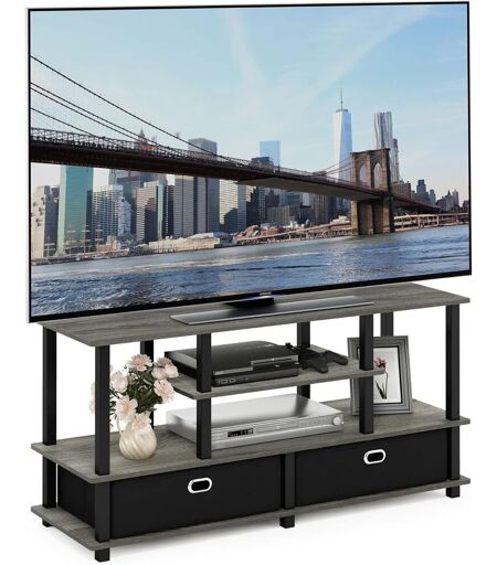 Design simple et élégant. Le grand panneau supérieur peut contenir un télév ur à écran plat jusqu'à 55 pouces. Matériau fabriqué à partir de bois composite de qualité CARB et de tubes en PVC. Les bacs de rangement non tissés offrent un espace de stockage caché pour ranger des objets en vrac tels que des DVD, des jeux et des CD. Facile à assembler. Manuel d'assemblage et pack de matériel inclus. Dimensions du produit 121 (L) x 57,9 (H) x 39,5 (P) cm. ...