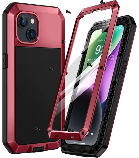 Coque Pour Iphone 14[Antichoc & Renforcé][Metallique] Incassable Solide Blindé Coque 360 Degré Full Body Heavy Duty Metal Protection Case Avec Du Verre Trempé, Rouge[Hou990610]