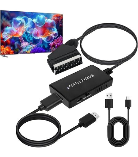 Convertisseur Péritel vers HDMI : Ce convertisseur Péritel HDMI transforme vos signaux analogiques Péritel en HDMI pour que vous puissiez profiter de vidéos en Full HD sur vos télév urs et moniteurs modernes. Idéal pour les appareils avec pr Péritel.Câble Péritel HDMI Inclus : Le câble Péritel HDMI fourni permet une installation rapide et facile. Connectez votre ancien matériel à un écran moderne grâce à cet adaptateur HDMI Péritel, compatible avec une large gamme de dispositifs.Compatibilité Étendue avec TV et Moniteurs : Util z cet adaptateur Péritel HDMI pour TV pour connecter des appareils comme des consoles de jeux ou des lecteurs DVD à des télév urs avec entrée HDMI, offrant une qualité d¿image supérieure en 720P ou 1080P.Facile à Installer, Plug and Play : Pas besoin de pilotes ou de configurations compliquées. Cet adaptateur Péritel vers HDMI pour TV est simple à installer, vous permettant de profiter immédiatement de vos vidéos en haute définition.Qualité de Signal Garantie : Profitez d¿une transmission de signal sans perte avec cet adaptateur pr Péritel vers HDMI. La technologie avancée assure une conversion préc , garantissant des couleurs et une résolution HD claires et nettes. ...