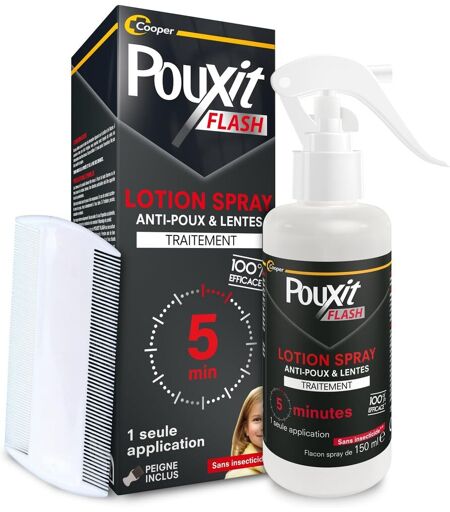 DITES ADIEU AUX POUX EN 5 MINUTES ! Grâce à son action rapide, Pouxit Flash ne nécessite que 5 minutes de pose pour éliminer poux et lentes (1). En format spray, il est pratique à utiliser et avec son peigne inclus, vous pouvez ensuite retirer facilement les poux et lentes morts. Pouxit Flash peut s¿utiliser dès l¿âge de 6 mois ainsi que chez les femmes enceintes ou allaitantes. Il convient à tous les types de cheveux. 1 flacon de 150 ml permet de traiter jusqu¿à 6 personnes infestées.TEMPS DE POSE FLASH : Grâce à son complexe unique le Dimétiol, cette formule plus rapide (2) bouche les orifices respiratoires et excrétoires du pou et de la lente en une seule application de 5 minutes (1) FORMULATION SANS INSECTICIDE (3) : Sans insecticide, Pouxit Flash ne contient pas de substance au mode d¿action neurotoxique sur le pou et la lente, il agit par effet mécanique.UTILISATION : Bien agiter le flacon avant utilisation, couvrir les épaules pour éviter de tâcher les vêtements. Pulvériser la lotion sur le cuir chevelu et les cheveux secs, des racines jusqu¿aux pointes, en veillant bien à ne pas oublier les oreilles, la nuque et les tempes. Masser les cheveux afin d'imprégner complètement la chevelure. Laisser le produit agir 5 minutes. Appliquer ensuite un shampooing sans mouiller les cheveux, en s'assurant de couvrir l'intégralité de la chevelure. Rincer. Si nécessaire, répéter l¿opération. Le traitement peut être réalisé sans peigne. Néanmoins, afin de faciliter le retrait des poux et lentes, il est conseillé d¿utiliser le peigne inclus.LEADER DES TRAITEMENTS ANTI-POUX EN France (4) depuis 2006, POUXIT est l¿allié des familles. POUXIT dispose d¿une large gamme de produits traitants et préventifs permettant une prise en charge complète de la pédiculose. La marque s'appuie sur des formules testées (5) et sans insecticide (3) conçues pour toute la famille. POUXIT innove régulièrement pour s¿assurer de continuer à offrir des solutions anti-poux les plus adaptées à chaque étape de l'infestation ...