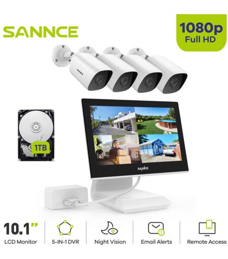 SANNCE 4CH Kits de Vidéosurveillance 10.1''Moniteur lcd 1080P 4 Caméra Extérieure/Intérieure Vision Nocturne Accès Distance Sécurité Caméra Système -1TB hdd