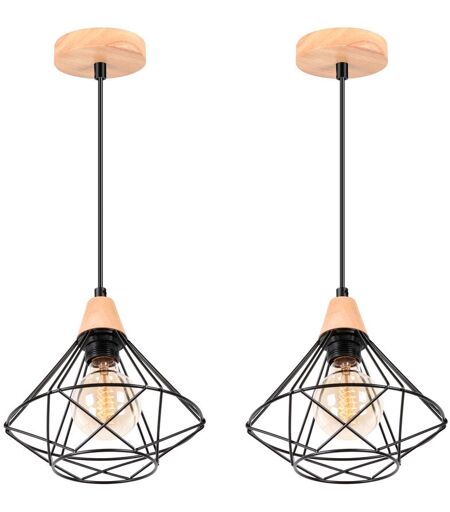 2x Lustre Suspension Cage Design en Métal et Bois Rétro Lampe Plafonnier Luminaire pour Chambre Couloir Escalier Noir ...