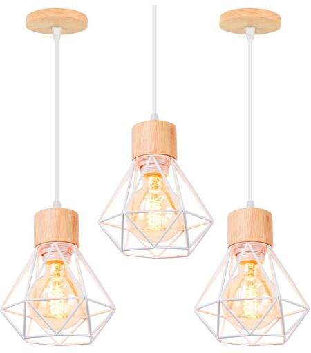 AXHUP 3 Pack Lustre Suspension Cage Diamant en Métal E27 Plafonnier Luminaire en Bois Blanc