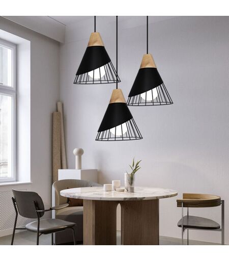 AXHUP Lot de 3 Industriel Lustre Suspension Créatif Abat-jour Ø25cm en Forme Badminton en Métal et Bois Plafonnier Lampe E27 pour Chambre Salon Cuisine Noir