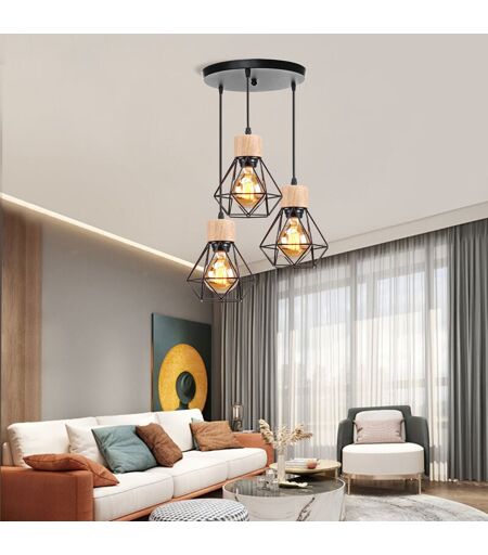 AXHUP Industrielle Suspension Luminaire Plafonnier 3 Abat-jours en Forme Diamant Lampe Lustre en Fer et Bois E27 pour Salon Cuisine Chambre Noir