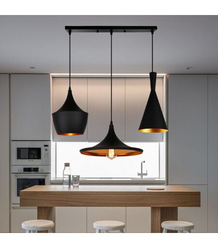 Lustre Suspension DESIGN avec son look vintage – rétro très tendance, ce Lustre Suspension moderne attirera tous les regards et illuminera la beauté de vos espaces de vie, comme le salon, la salle à manger, la cuisine, le couloir ou les chambres. ECLAIRAGE la lampe de plafond de design industriel est équipée d’une douille E27 pour ampoules LED ou halogènes d’une puissance de 60 Watt maximale. Nous recommandons des ampoules à filaments de type Edison afin de compléter l’aspect vintage. REGLABLE câble réglable, vous pouvez l’ajuster selons votre besoin, il peut etre comme un Lustre Suspension aussi quand vous réduire le longueur de câble MONTAGE – afin de vous faciliter l’installation, tout le matériel nécessaire pour le montage, vis et chevilles, est fourni. Le Lustre Suspension attire l’attention dans votre maison. • Design: Vintage, Industrielle • Matériau: Fer • Douille: E27 • nombre d’ampoule requise: 3x ampoule (non inclus dans notre paquet) • Ampoule: LED/Edison/à incandescence • ...