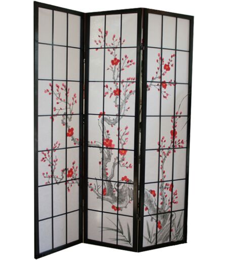 Paravent bois noir avec fleurs de cerisier composé d'une structure en bois verni avec charnières double sens et panneaux avec quadrillage sur un côté et papier de riz blanc. Occultant, ce paravent vous permettra de créer une séparation tout en conservant la luminosité. Existe en 3, 4 et 5 pans. ...