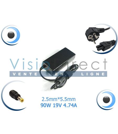 Alimentation chargeur générique marque Visiodirect puissance 90W Output: 19V 4.74A Dimensions de l'embout: Diamètre intérieur: 2,5mm Diamètre extérieur: 5,5mm Le câble électrique du chargeur a la prise electrique est fourni. Chargeur aux normes CE, garantie 12 mois. ...